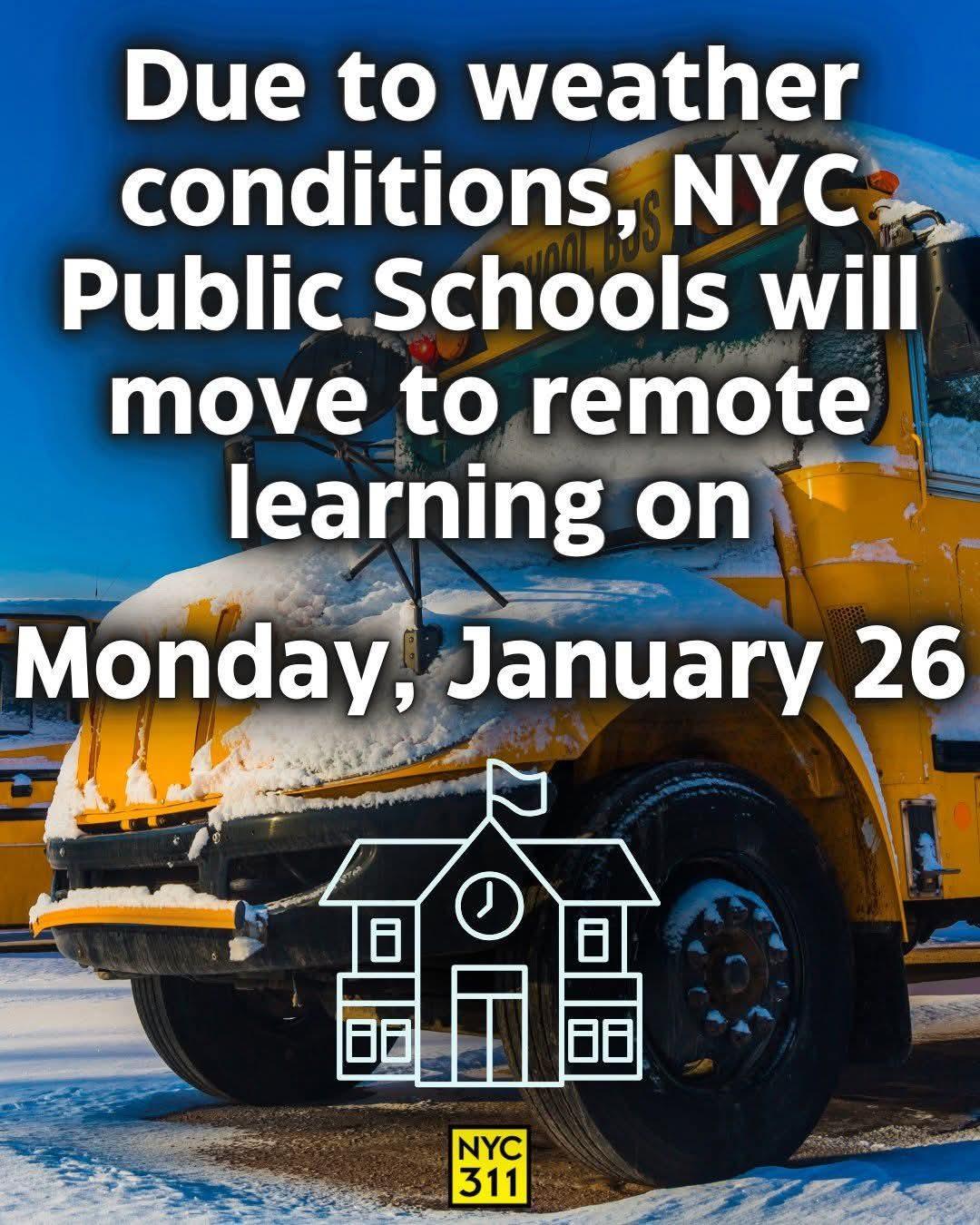 As confirmed by the NYC Department of Education, all NYC Public School buildings will be closed on Monday, January 26, and students will learn remotelyhttps://www.schools.nyc.gov/